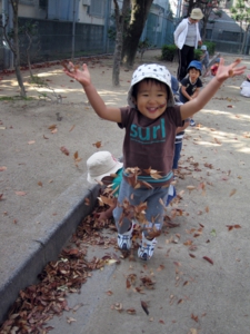そのためには、天気の良い日は積極的にお散歩(お散歩マップはこちら)に出かけていきます。また、砂遊び、泥んこ遊び、水遊びは、千変万化するすばらしいあそびであるため、いつでも思い切り楽しめ、開放感を味わいながらのびのびと遊べるように工夫したいものです。ドロドロの洗濯物にため息をつかず、「ああ、今日も元気にあそんだな。」と意欲いっぱいのわが子の姿に笑顔を向けてあげましょう。