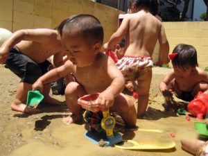 乳児は皮膚の感覚機能が未発達です。だから、暑さ・寒さに皮膚が対応して、熱を発散させたり、発散を防いだりする機能を育てるため、薄着に取り組んでいます。(0歳児クラスの時から一年中半そで、半ズボンですごしています)厚着は子どもの動きを妨げます。運動をすることで筋肉や骨格、体が育っていく乳児にとっては、薄着になって体をたくさん動かすことが好ましいと考えます。気温の変化に対して体が順応できず、抵抗力が落ちるためにひいてしまう風邪も、厚着にしたからといって防げるものではありません。大切なのは急激な気温の変化に対して体がうまく適応できるように、普段から鍛錬することです。