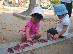 そのためには、天気の良い日は積極的にお散歩(お散歩マップはこちら)に出かけていきます。また、砂遊び、泥んこ遊び、水遊びは、千変万化するすばらしいあそびであるため、いつでも思い切り楽しめ、開放感を味わいながらのびのびと遊べるように工夫したいものです。ドロドロの洗濯物にため息をつかず、「ああ、今日も元気にあそんだな。」と意欲いっぱいのわが子の姿に笑顔を向けてあげましょう。
